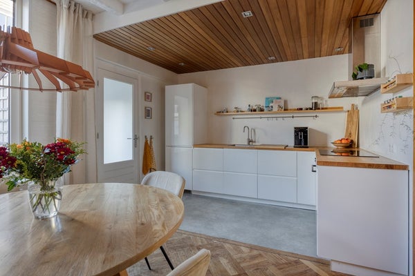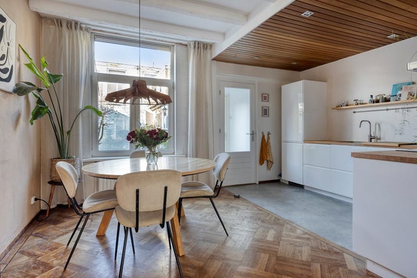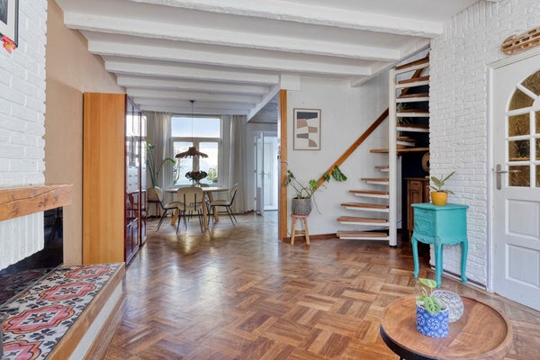 Ground floor: Through the entrance, you enter an attractive hall with access to the spacious living room. This living room is wonderfully wide and deep, with a comfortable sitting area at the front and a cozy dining area at the rear. The characteristic high ceilings and large windows make the living room beautifully bright and feel particularly spacious. An atmospheric fireplace forms the heart of the living room and provides extra coziness on cold evenings. From the dining room, you walk into the modern handleless kitchen (2020), which is fully equipped: a 4-burner induction hob, extractor hood, dishwasher, fridge-freezer combination, and plenty of cupboard space. The kitchen offers beautiful views of the sunny garden. At the rear of the ground floor is a practical hallway with access to the bathroom and a convenient storage room/laundry room. The bathroom is fully equipped with a bathtub with shower function, toilet, and washbasin.