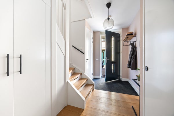 Aankomst op eigen terrein met plaats voor twee auto’s en één in de (verwarmde) garage. In de entree bevinden zich de garderobekast, het toilet en de meterkast.