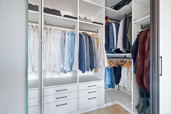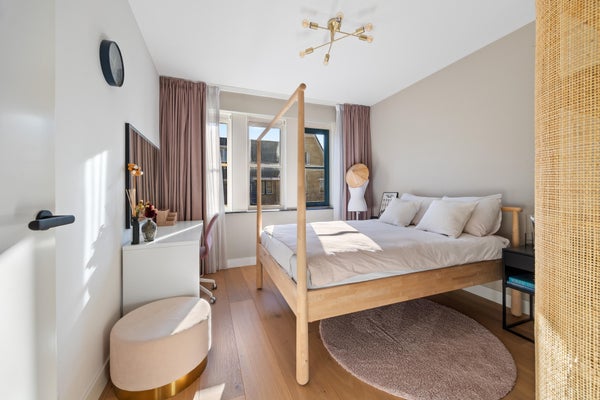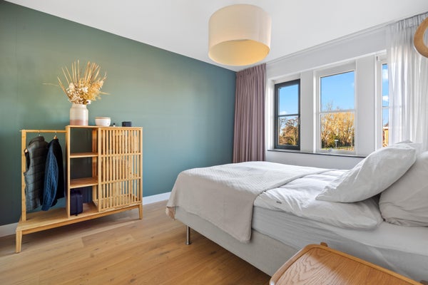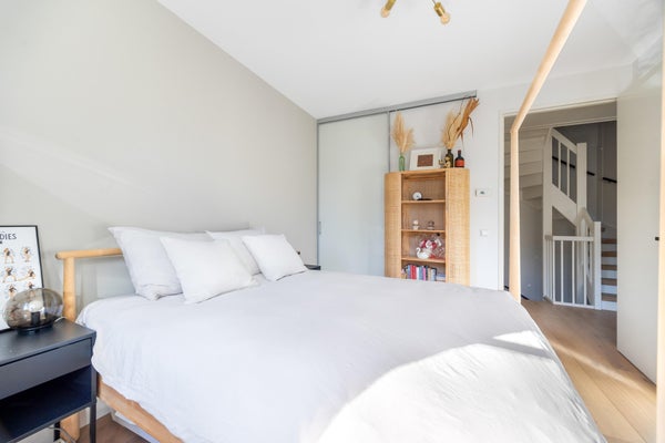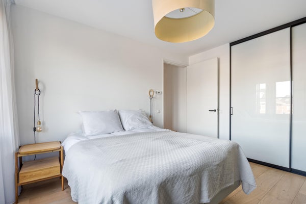 De master bedroom aan de achterzijde beschikt over een eigen walk-in-closet. Ook op deze verdieping ligt een massief eiken vloer met per kamer regelbare vloerverwarming.