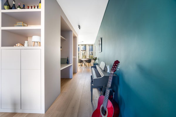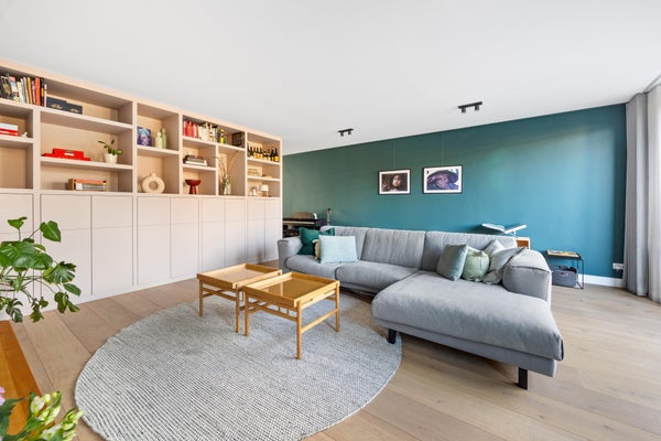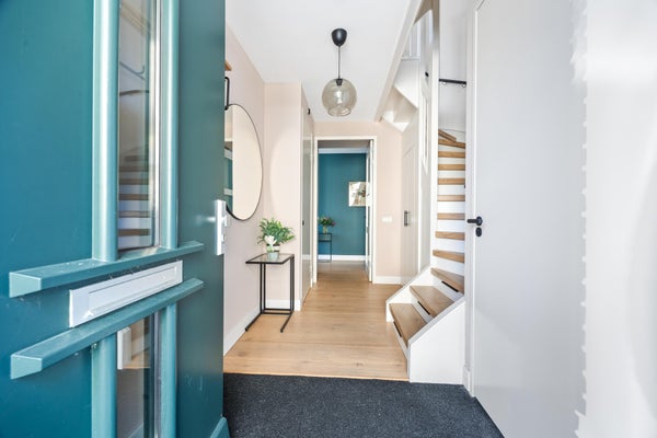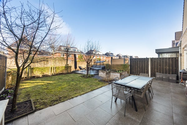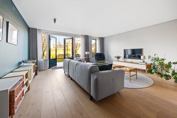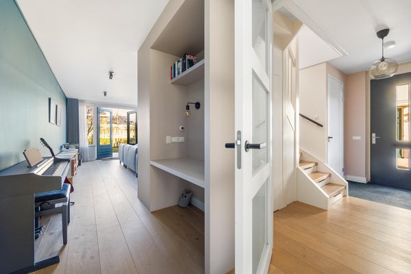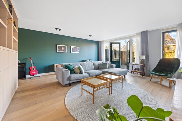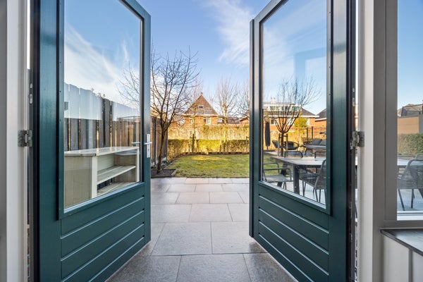 De tussendeur leidt naar de riante woonkamer met massief eiken vloer. De grote achterpui zorgt voor een prachtige lichtinval en een directe verbinding met de tuin via de openslaande deuren.