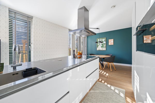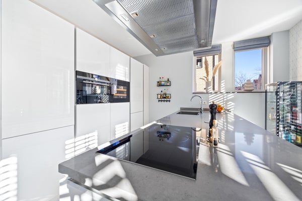 Aan de voorzijde bevindt zich de leefkeuken, het hart van het huis. Het kookeiland met inductiekookplaat (3 pitten en 2 zones) nodigt uit tot lange avonden tafelen. De keuken is compleet uitgerust met koelkast, vriezer, combi-oven en een wijnklimaatkast.