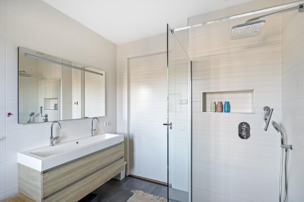 De luxe badkamer is uitgerust met een ligbad, inloopdouche en dubbele wastafel — een comfortabele ruimte waar rust en functionaliteit samenkomen.