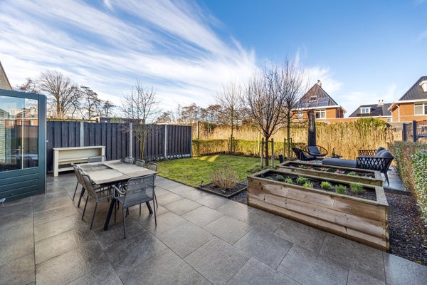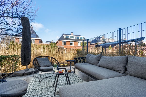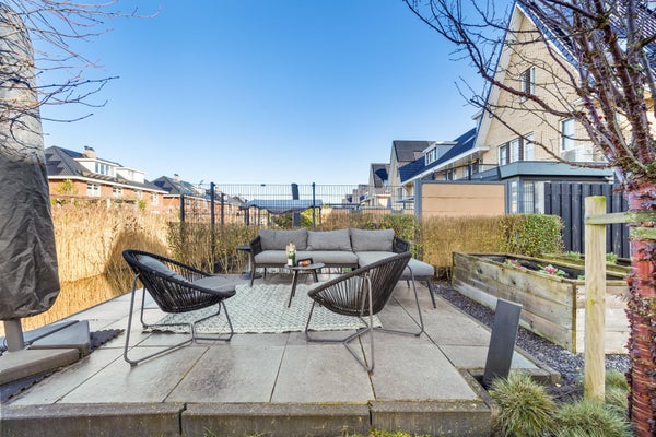 De achtertuin is gelegen op het noordwesten, maar verrast met een uitstekende zonligging. Vanaf de ochtendzon langs het water tot de avondzon op het terras: hier geniet u vrijwel de hele dag van zon, privacy en rust.