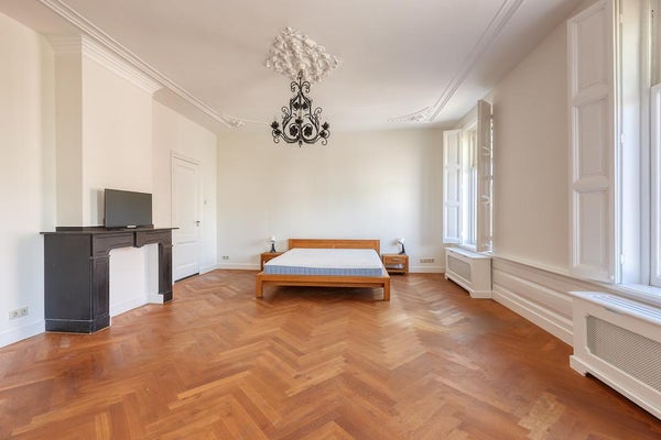 Vanuit de hal loopt u via de statige trap omhoog naar de eerste verdieping. Aangekomen op de overloop is er toegang tot een ruime slaapkamer voorzien van vaste kasten en parketvloer. Tweede kamer met kitchenette en klein balkon aan de achterzijde – ideaal als werk/wasruimte. Separaat toilet op de overloop. Daarnaast bevindt zich hier een royale bibliotheek en een kantoorruimte met uitzicht op de straatzijde.