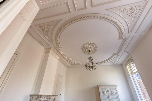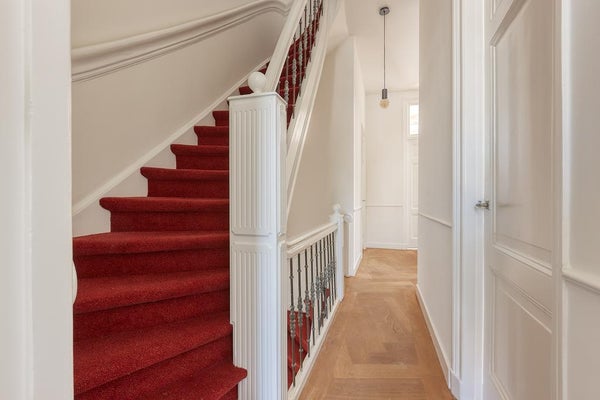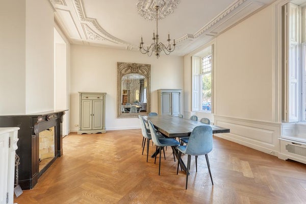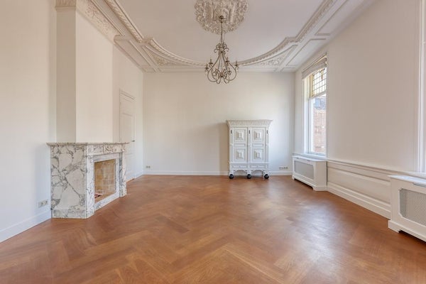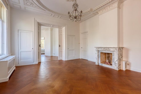 U komt binnen in de ruime entreehal met originele marmeren vloertegels en garderoberuimte. Separaat toilet met fonteintje. De lichte, royale woonkamer op de hoek heeft een sfeervol plafond met ornamenten, glas-in-loodramen en een visgraat parketvloer. Aan de achterzijde bevindt zich de halfopen keuken, uitgevoerd in massief hout met een granieten werkblad, luxe inbouwapparatuur en een spoeleiland met Quooker, vaatwasser en dubbele Amerikaanse koelkast. Via openslaande deuren stapt u zo de fraai aangelegde, stadstuin in.