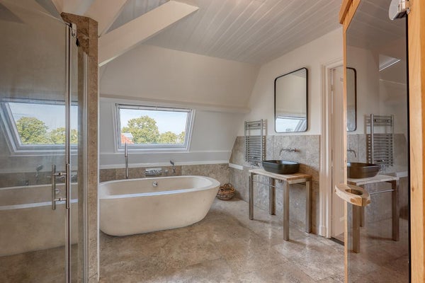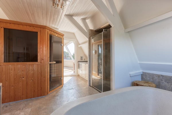 Open ruimte met veel lichtinval door de dakramen, een extra slaapkamer en een tweede luxe badkamer met ligbad, inloopdouche, wastafel en sauna. Vanuit deze verdieping heeft u toegang tot een zonnig en beschut dakterras met houten Japans zitbad.