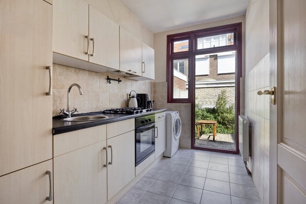 De keuken is praktisch en compleet ingericht met onder andere een kookfornuis met heteluchtoven, koel-vriescombinatie, veel opbergruimte en aansluiting voor wasmachine. Vanuit hier loopt u zo de beschutte tuin in, groot genoeg voor een gezellige eettafel én speelruimte voor kinderen.