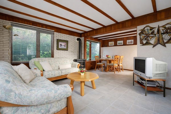 The living area is directly connected to the sunny, green garden through sliding doors. The garden features two spacious sheds, providing ample storage space.