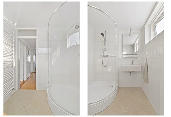 • De badkamer (2005) is volledig betegeld en voorzien van een douchehoek, wastafel en 2e toilet.