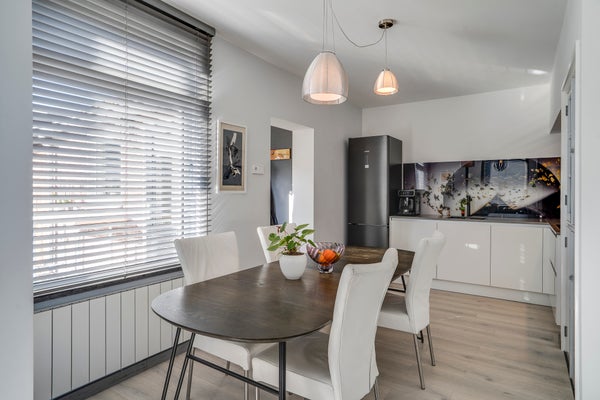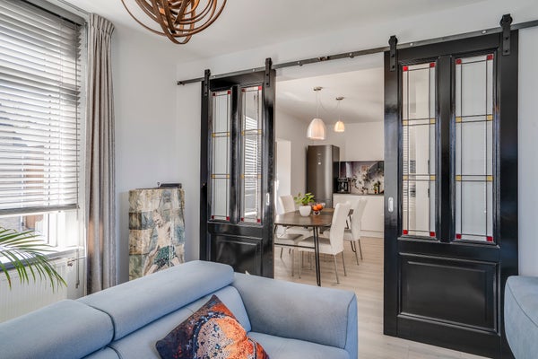 • Woonkamer: sfeervolle doorzonwoonkamer met veel lichtinval dankzij de grote raampartijen en voorzien van en-suite deuren tussen de woonkamer en keuken.