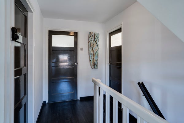 Overloop met toegang tot 3 slaapkamers, de badkamer en een separate toiletruimte.