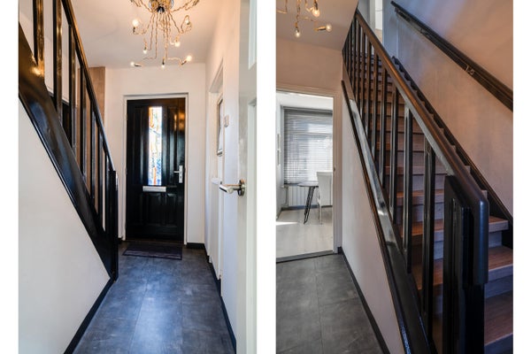 Via de ruime entree/hal met meterkast en trapopgang heeft u toegang tot de werk-/slaapkamer en de keuken. De begane grondvloer is geïsoleerd en voorzien van comfortabele vloerverwarming (woonkamer, keuken, berging, wc) met een moderne PVC-vloer.
