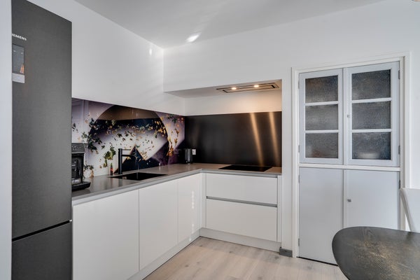 • Leefkeuken: in 2019 volledig vernieuwd en uitgevoerd in een moderne stijl met veel kastruimte en diverse inbouwapparatuur, waaronder een inductiekookplaat, ingebouwde afzuigkap, vrijstaande koel/ vriescombinatie, separate magnetron in kast. Vanuit de keuken is de kelder bereikbaar.
