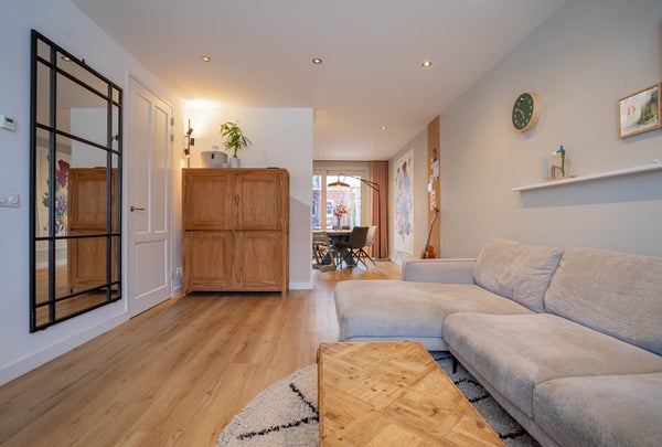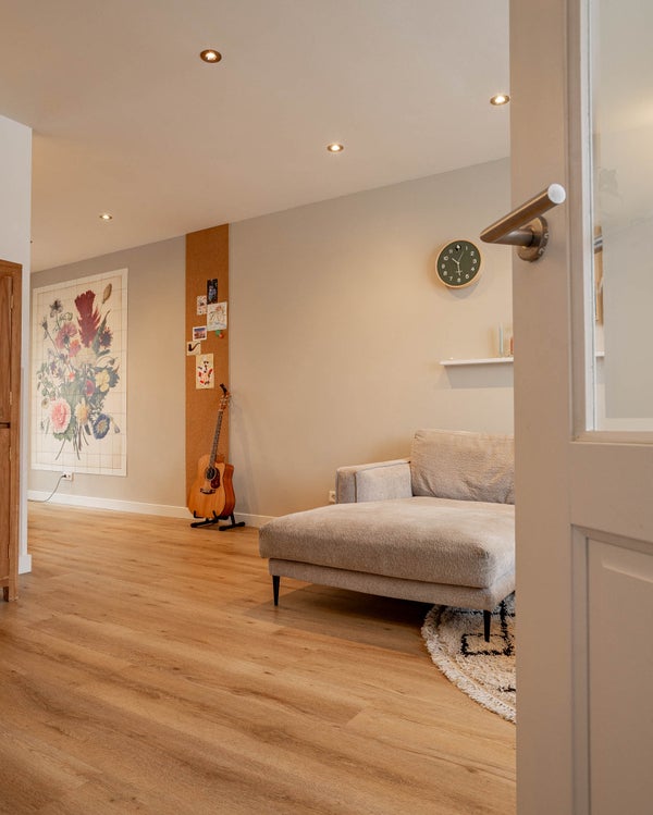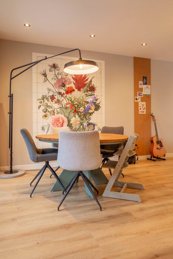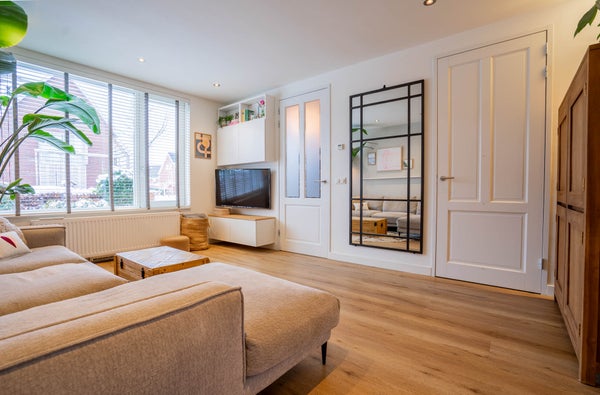 De moderne woonkamer voelt direct prettig aan: een pvc-vloer met vloerverwarming, gestuukte wanden en plafonds, een royale zithoek en veel daglicht dankzij de grote raampartij. De ruimte is sfeervol en functioneel ingedeeld, met een fijne zithoek voor uw dagelijkse comfort.