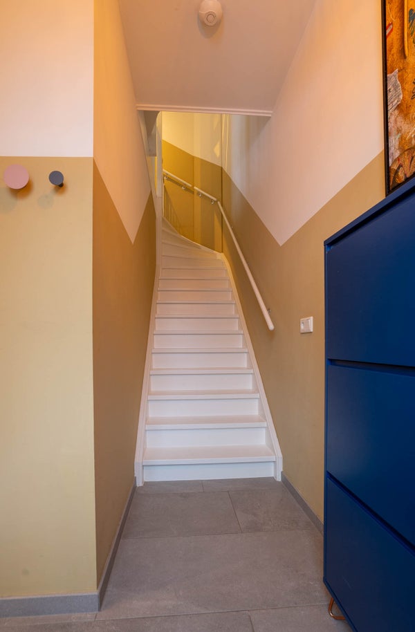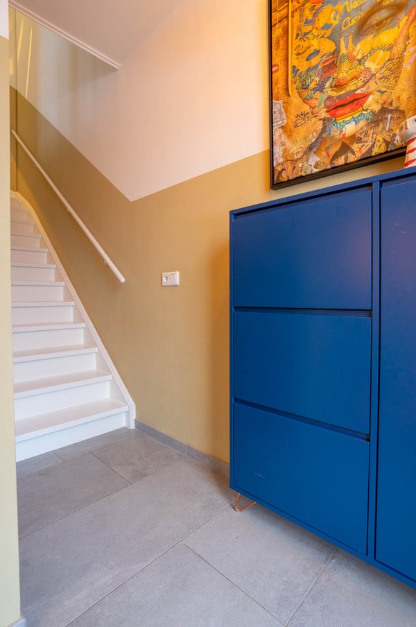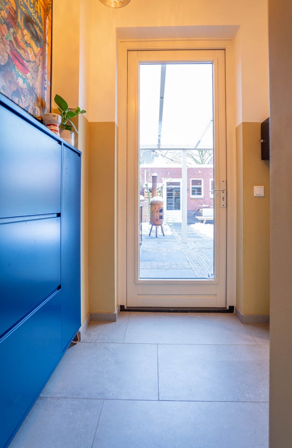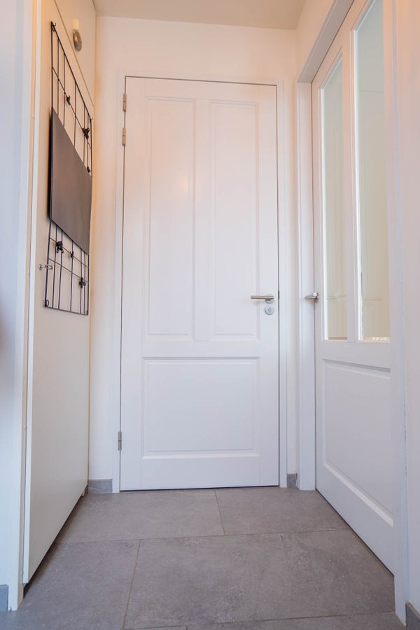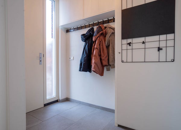 De verzorgde hal biedt toegang tot de toiletruimte en de woonkamer. U treft hier een tegelvloer met vloerverwarming, gestuukte wanden en plafonds en voldoende ruimte voor uw garderobe—een nette, praktische ontvangst.