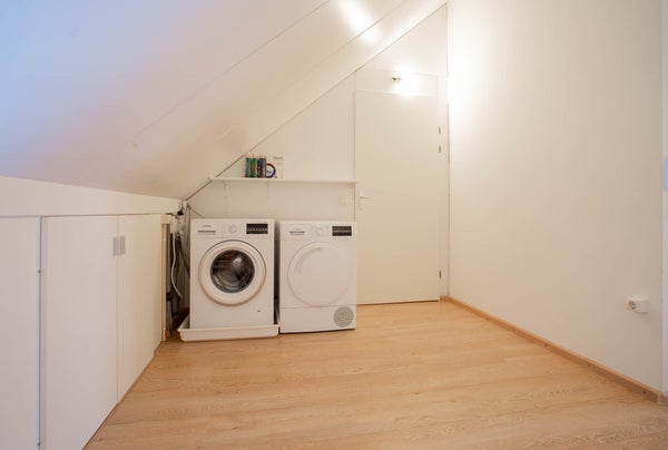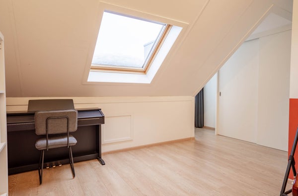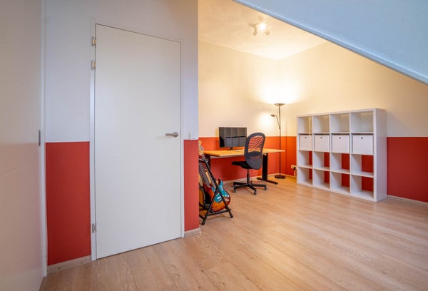 Via een vaste trap bereikt u de zeer ruime zolderverdieping, uitstekend geschikt als vierde slaapkamer of werkplek. U beschikt over een dakraam, laminaatvloer, gestuukte wanden en een praktische kastenwand met schuifdeuren voor extra opslag. Daarnaast is er een aparte ruimte voor het witgoed en de warmtepompinstallatie inclusief zonneboiler.