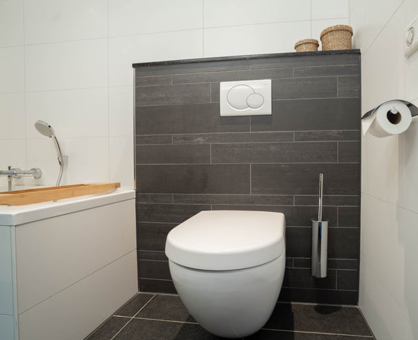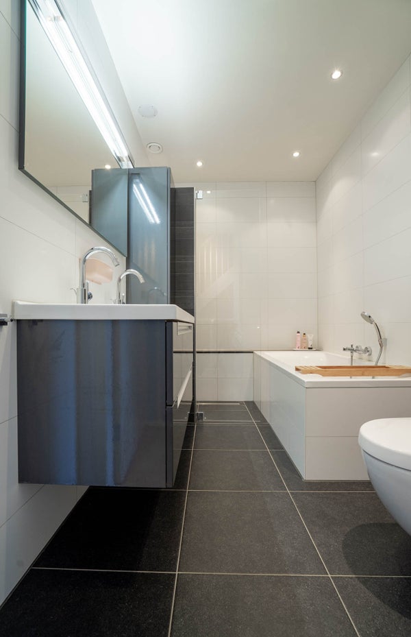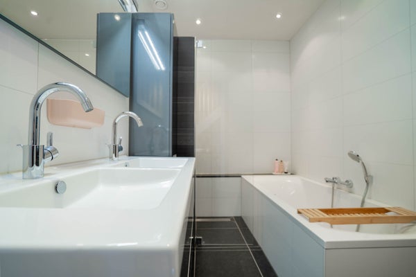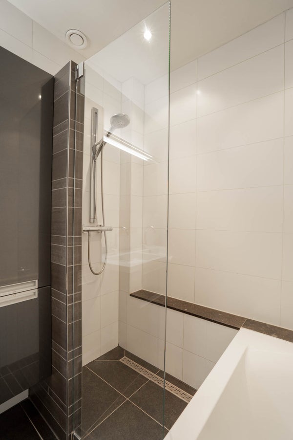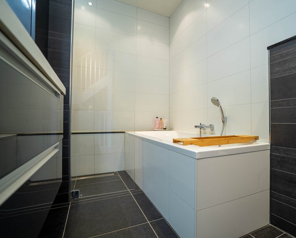 De royale, volledig betegelde badkamer is keurig onderhouden en van alle gemakken voorzien: ligbad, inloopdouche, toilet en een dubbele wastafel met meubel. Dankzij vloerverwarming en ingebouwde speakers heeft u hier een comfortabele beleving.