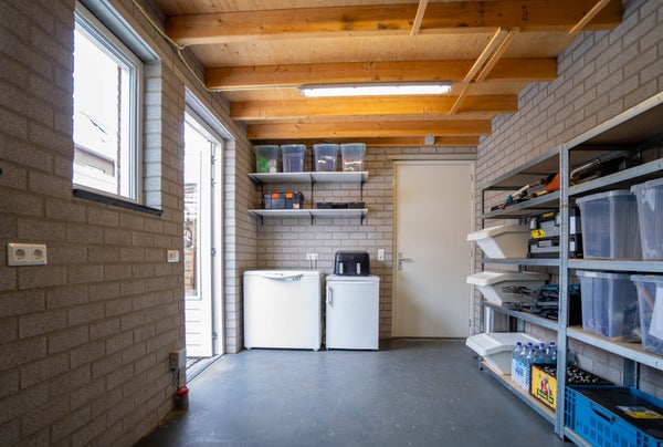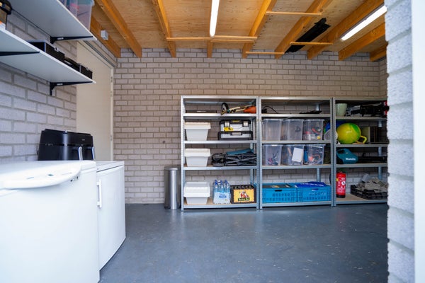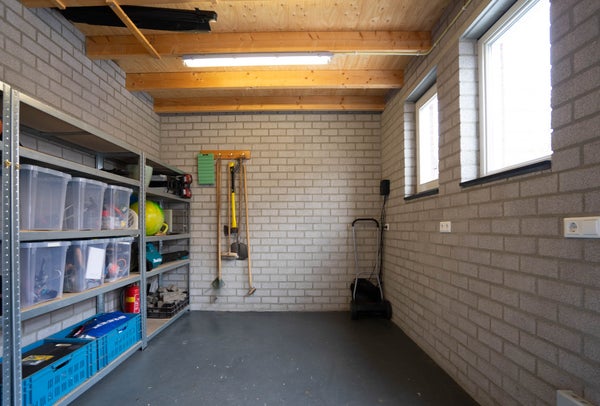 Achterin de tuin staat een vrijstaande, royale berging—ideaal voor fietsen, tuinspullen en extra opslag.