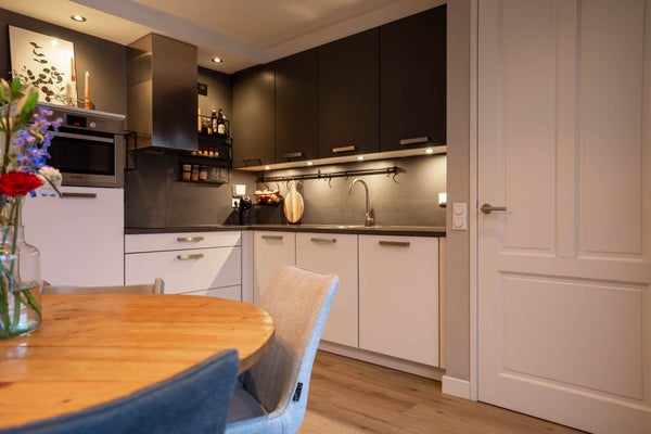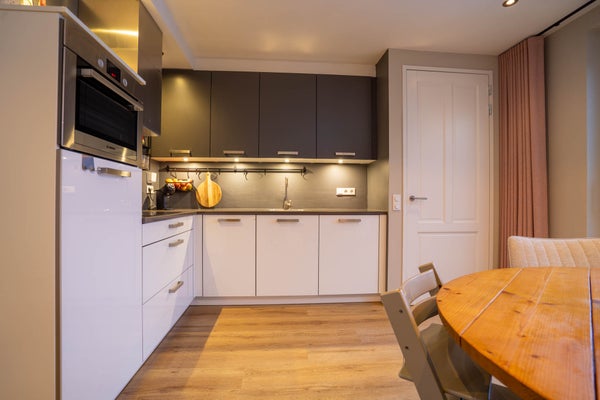 De open, L-vormige keuken sluit naadloos aan op de woonkamer. Ook hier vindt u een pvc-vloer met vloerverwarming en gestuukte wanden en plafonds. De keuken is keurig afgewerkt en het grote raam zorgt voor extra lichtinval tijdens het koken.