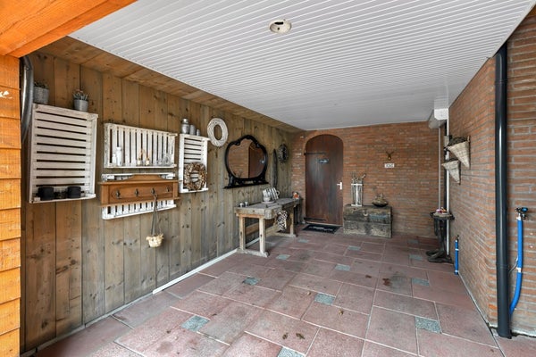 Aansluitend vind je de bijkeuken: een praktische ruimte met uitstortgootsteen en een deur naar de carport – ideaal voor extra opslag, de was of natte jassen na een regenbui.
