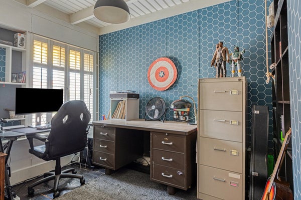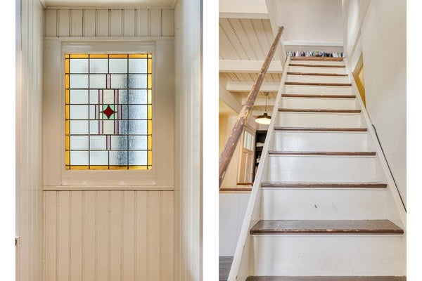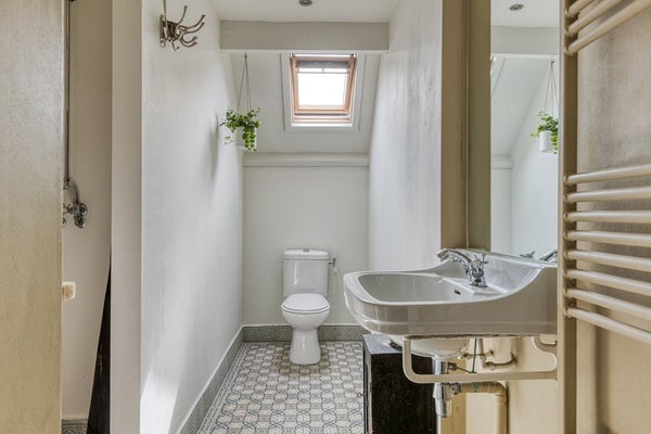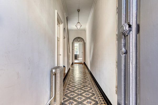 Via de karakteristieke voordeur kom je in een lange hal met gestucte wanden en een mooie authentieke tegelvloer die direct de sfeer van het huis weerspiegelt. Originele paneeldeuren, bakkelieten schakelaars en andere jaren ’20-details geven dit huis een uniek karakter.