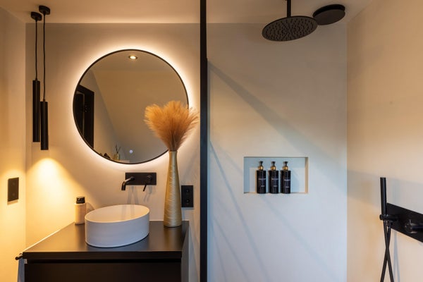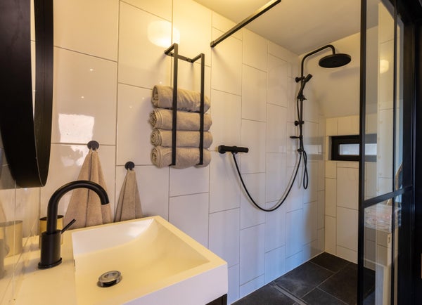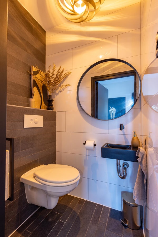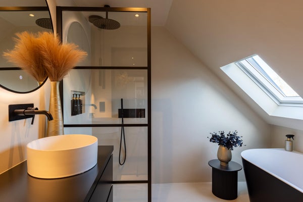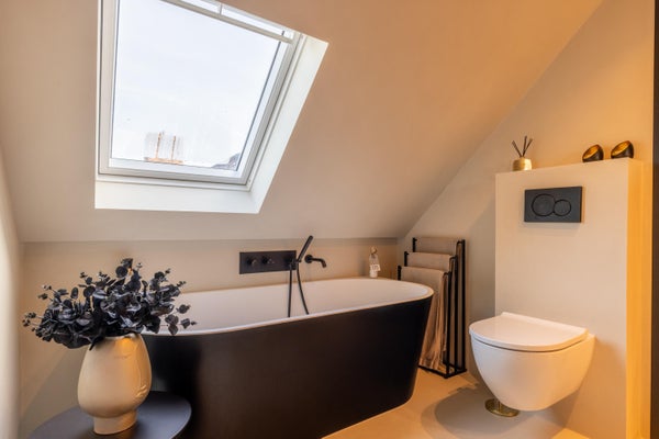 Als klapstuk bekijken we met een glimlach de luxe badkamer die pas gerealiseerd is! Een heel fraai exemplaar waar je de dag rustig kan beginnen of helemaal in stijl kan afsluiten door het ligbad vol te laten lopen en even een momentje voor jezelf te pakken. De ruime inloopdouche is perfect gesitueerd in de hoek, verder een breed wastafelmeubel en natuurlijk een tweede toilet. Ook aan vloerverwarming en mechanische ventilatie is gedacht!