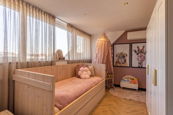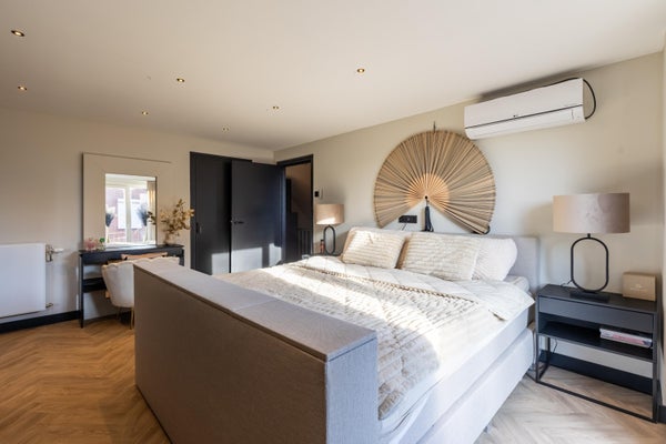 Vanaf de overloop stappen we beurtelings de drie slaapkamers binnen die qua afwerking, net als beneden, niks te wensen overlaten. De strak gestucte plafonds in alle kamers zijn goed geïsoleerd wat bijdraagt aan het comfort, net als airconditioning om te koelen of te verwarmen. De elektrisch bedienbare rolluiken dragen bij aan een perfecte nachtrust op deze fraaie verdieping.