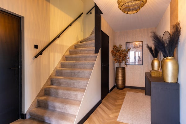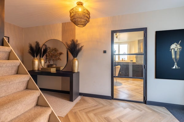 De keus voor een parkeerplaats is niet zo moeilijk, meerdere auto’s passen hier gemakkelijk op de eigen oprit. Zodra je de voordeur opent, voel je het meteen: deze woning is met zorg en smaak verbouwd. Je stapt binnen in een fraaie hal waar mooie materialen en een strakke afwerking een uitnodigende eerste indruk maken. We openen links de deur van het modern betegelde toilet met fontein. De brede trapopgang (met handige trapkast) laten we voor nu links liggen en bekijken met een glimlach de zwarte stalen deur. Deze moderne eyecatcher verbindt de hal op een subtiele manier met de woonkeuken waardoor er een mooie doorkijk en een gevoel van ruimte ontstaat.
