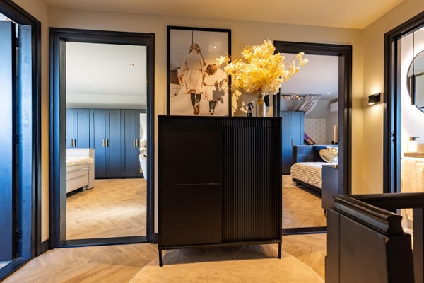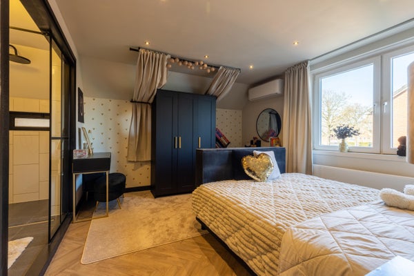 De master slaapkamer mag met recht deze titel dragen door z’n afmeting, handige vaste kast en een deur die toegang geeft tot het balkon. De tweede slaapkamer kan zo in een magazine door de extra ensuite badkamer die hier is gecreëerd. Op elegante wijze gescheiden door een glazen wand met zwart stalen accenten is dit een ruimte die al snel een luxe hotelgevoel oproept. Er zal vast en zeker geloot moeten gaan worden wie deze kamer gaat krijgen, want dit is zonder twijfel een kamer die iedereen graag gaat claimen! Ook de derde slaapkamer is van een mooi formaat met een luik dat toegang geeft tot een tweede royale bergzolder met stahoogte.