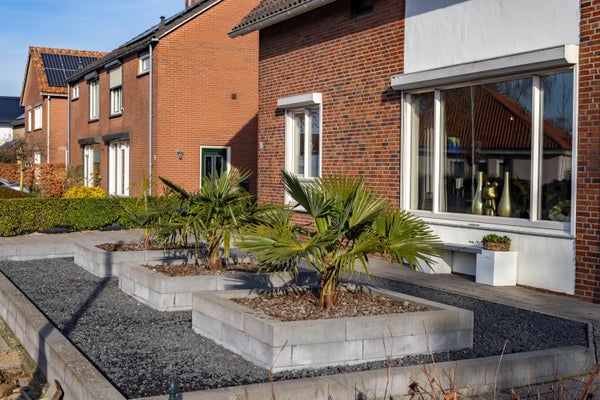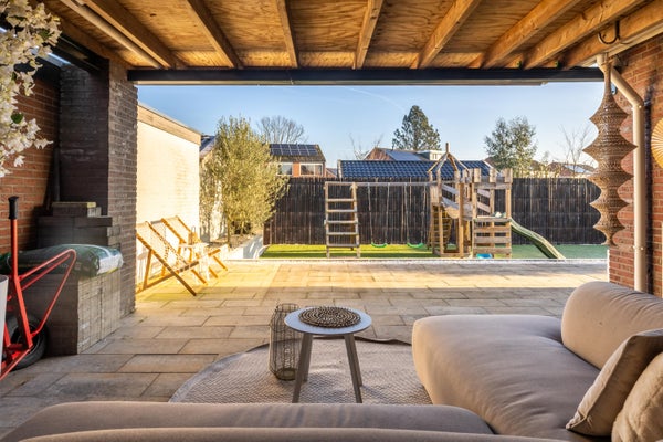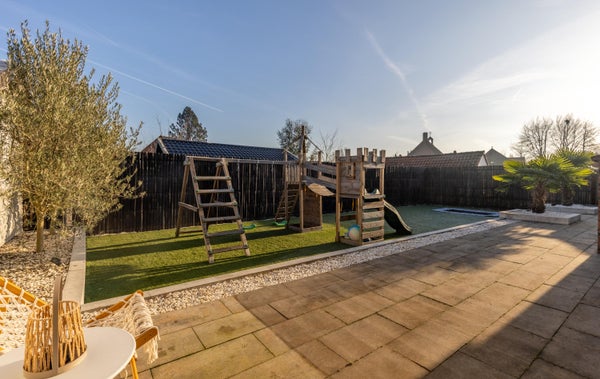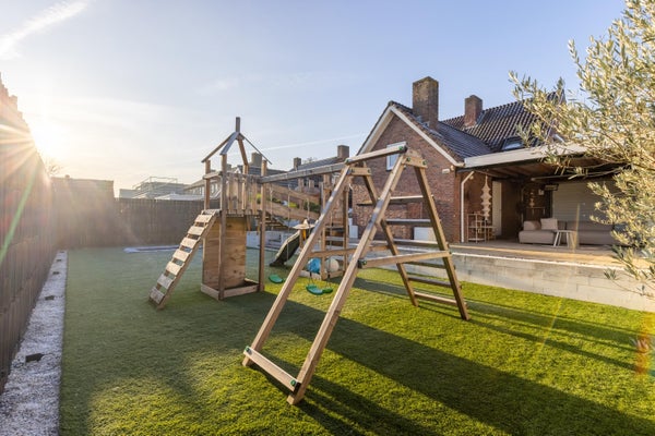 De achtertuin is een heerlijke, vrije buitenruimte waar rust, comfort en speelsheid samenkomen. Het subtiele hoogteverschil geeft de tuin een dynamisch karakter en zorgt voor een leuke indeling in verschillende zones. Zo kun je kiezen voor een zonnig terras op hoogte om te ontspannen en tafelen, terwijl iets lager een uitnodigende speelplek op het strakke kunstgras is gecreëerd.