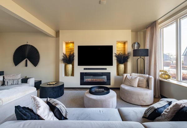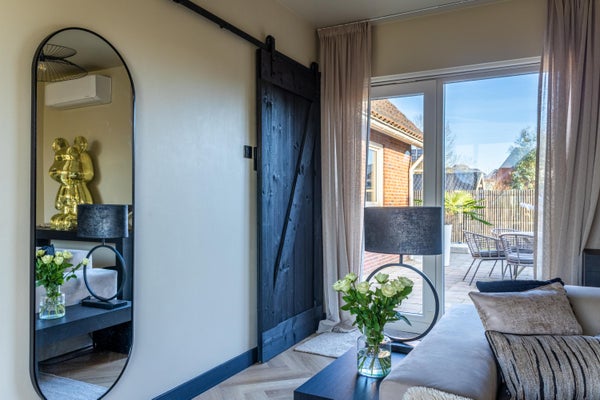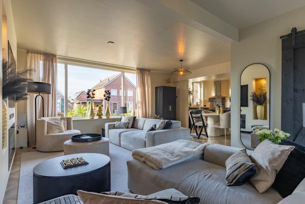 Door naar de woonkamer die rust, luxe en warmte uitstraalt en gekenmerkt wordt door overvloedige lichtinval en de doordachte indeling. Centraal in de ruimte vormt de elektrische haard een echte blikvanger. De strakke vormgeving en het zachte vlammenspel zorgen voor sfeer en comfort, zonder het interieur te overheersen. Aan weerszijden twee leuke nissen die niet alleen functioneel zijn maar ook een decoratief statement maken. De subtiel geïntegreerde verlichting accentueert zorgvuldig de geplaatste accessoires en geeft de wand extra diepte, vooral in de avonduren. Al stijlvolle afsluiting beschikt de woonkamer over een ruime vaste kast die achter een elegante schuifdeur schuilgaat. Functionaliteit en design gaan in deze woonkamer hand in hand. De verbinding tussen binnen en buiten door de tuindeur versterkt het gevoel van ruimte en gaat met de eerste zonnestralen in de ochtend gelijk open.