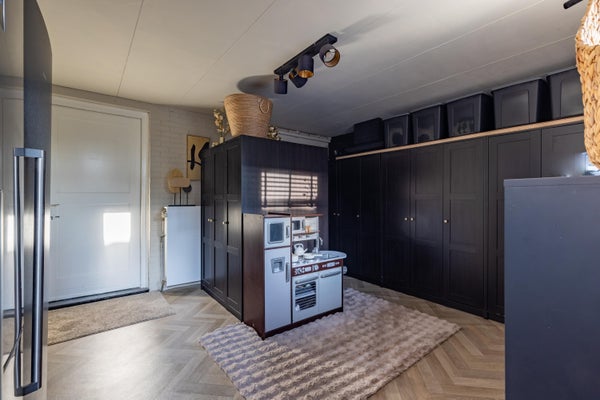 De gezellige woonkeuken is een sfeervolle ruimte die direct uitnodigt om lang te blijven hangen. Genoeg raampartijen zorgen voor een mooie lichtinval en een leuke wegkijk door de straat. De keuken in hoekopstelling is strak vormgegeven, maar met een warme uitstraling die helemaal past bij het karakter van de woning. Het royale werkblad, alle benodigde apparatuur en de praktische indeling maken dit een plek waar koken een feestje wordt. Of je nu uitgebreid wilt koken voor vrienden of gewoon een snelle maaltijd bereidt, alles is hier binnen handbereik.