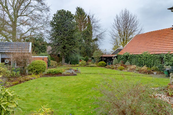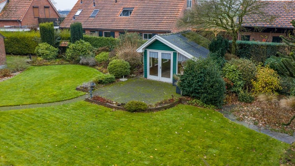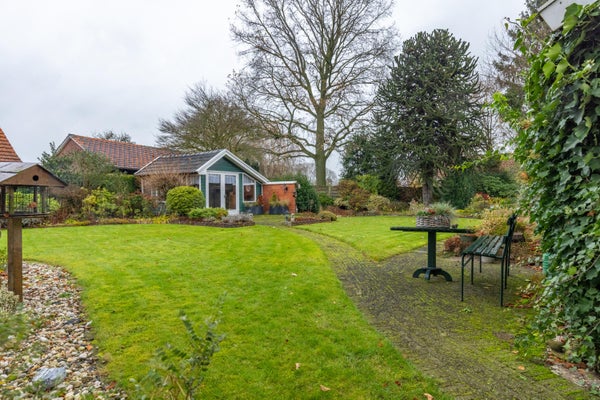 De tuin is groen, breed en heerlijk uitnodigend. Je beschikt over een supergrote schuur met zolder. Een brede garage met elektrische kanteldeur met daarachter een overkapping voor opslag. Het tuinhuis leent zich voor lange avonden met goede wijn, verhalen en vrienden. De tuin ademt vrijheid. Vogels, stilte en weidse luchten zijn hier dagelijkse kost.