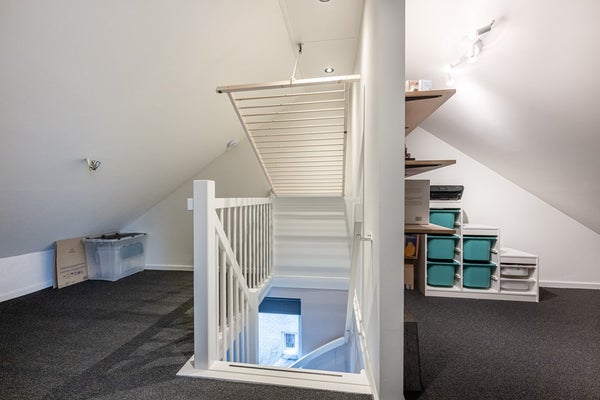 Overloop met vloerbedekking, voorzolder met bergruimte.