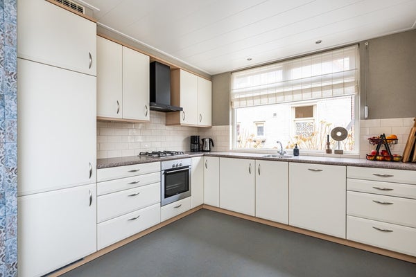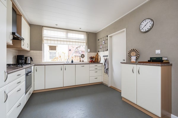Marmoleumvloer met vloerverwarming, 4-pits gaskookplaat, elektrische oven, afzuigkap, vaatwasser, enkele spoelbak, koelkast en spots in plafond.