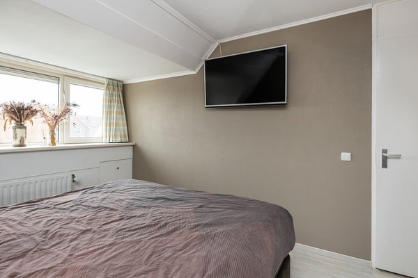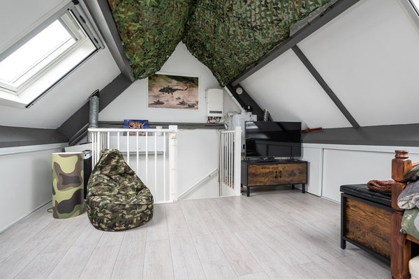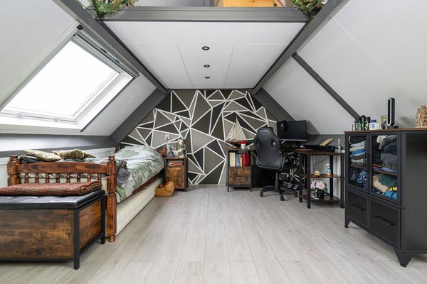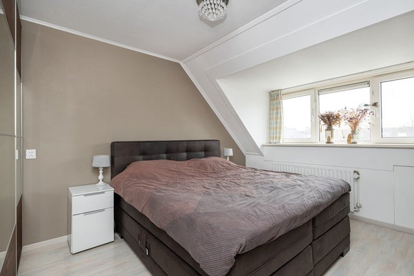Laminaatvloer, dakkapel met elektrisch rolluik, hor, kunststof kozijn voorzien van HR++ glas en een radiator.