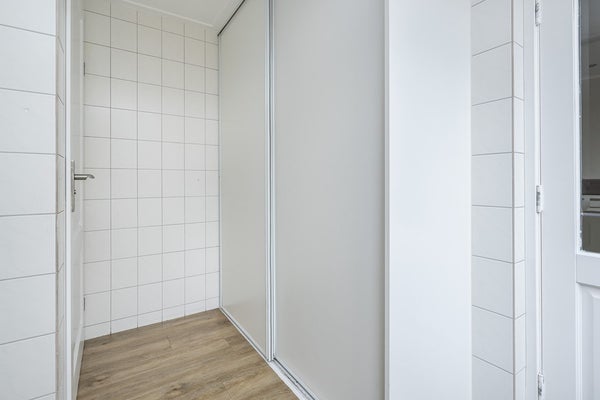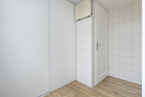 PVC vloer v.v. vloerverwarming, 2 x schuifkast met witgoedopstelling, deur naar achtertuin, hor en spots in plafond.