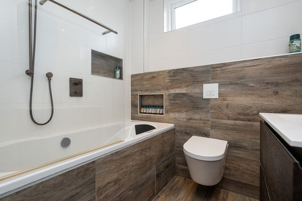 Plavuizenvloer met elektrische vloerverwarming, wastafel met meubel, badkamerspiegel met verlichting en anti-condens verwarming, mechanische ventilatie, zwevend toilet, douchen in een bad met whirlpoolfunctie en lichttherapie, spots in plafond, elektrische afzuiging en een elektrisch uitzetraam.