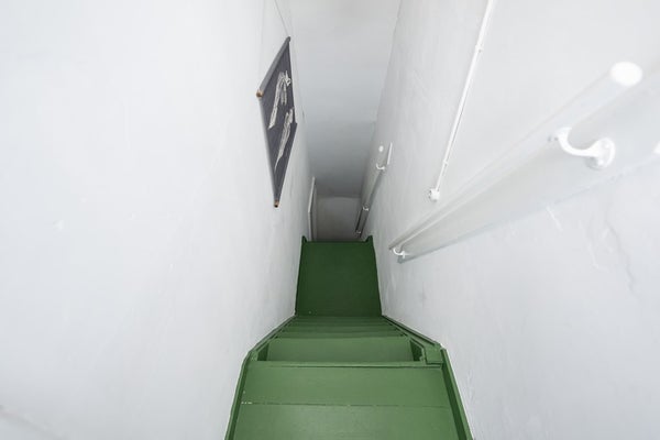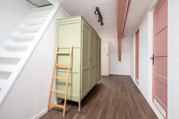PVC-vloer, radiator, trapopgang en houtkachel.