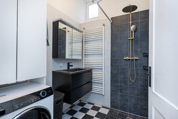 Douche, wastafel met meubel, spiegelkast, handdoekenradiator, witgoedaansluitingen en geheel betegeld.