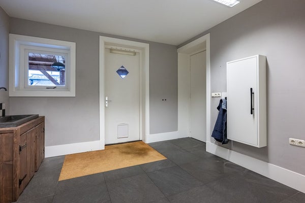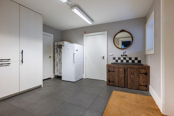 Plavuizen vloer met vloerverwarming, wasbak met meubel (warm + koud), vaste kast met witgoedopstelling, ingebouwde waskoker vanuit 1e verdieping en toegangsdeur naar overkapping.