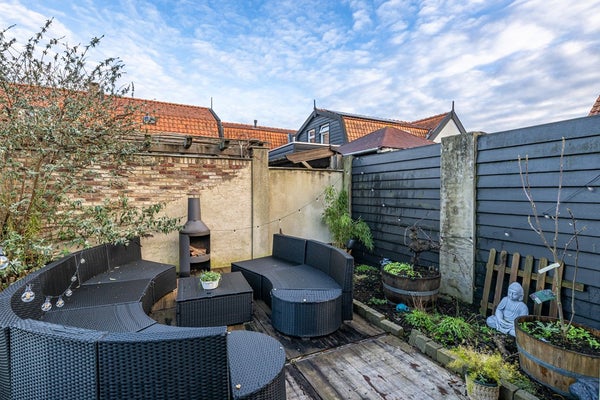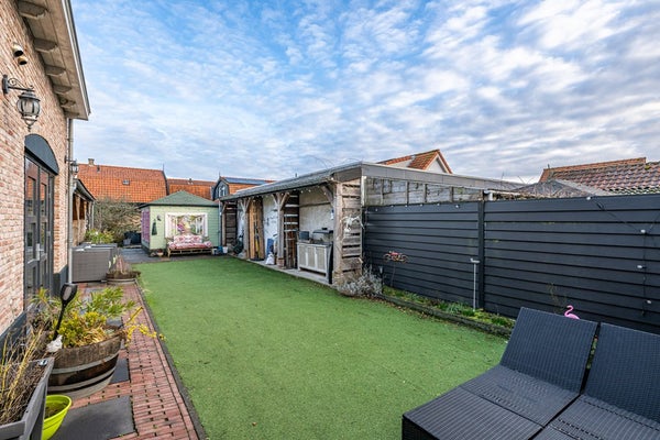 Deels bestraat, deels kunstgras, stalen schutting, terras, buitenkraan, eigen achterom en tuinhuis voorzien van elektra en verlichting.