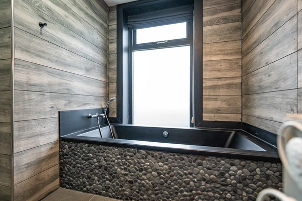 Plavuizen vloer met vloerverwarming, geheel betegeld, ligbad, 2 x waskom met meubel, inloopdouche en spots in plafond.