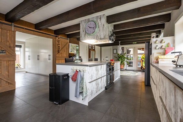 Plavuizen vloer met vloerverwarming, kookeiland met 4 barkrukken, Belling Farmhouse 90Ei – 90 cm breed inductie rangefornuis met drie ovens, grillfunctie, vier inductiezones en een warmhoudplaat, afzuigkap, spoelbak met RVS keukenkraan met veermechanisme, dubbele bediening en uittrekbare sproeikop, vaatwasser, koelkast, combi-oven, Amerikaanse koelkast met water- en ijsdispenser, speksteen houtkachel, openslaande deuren naar tuin en openslaande deuren naar overkapping.