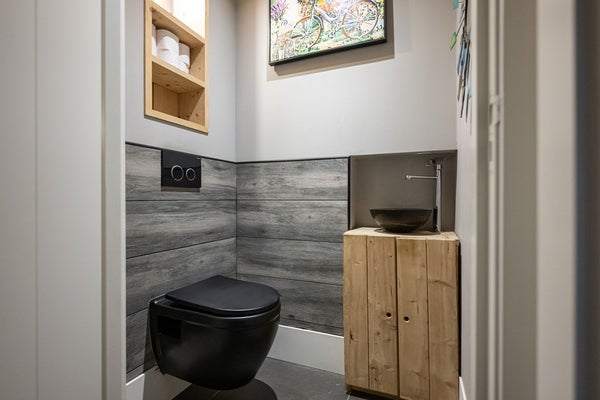 Marmeren vloer met vloerverwarming, zwevend toilet, fontein met onderkast en mechanische afzuiging.