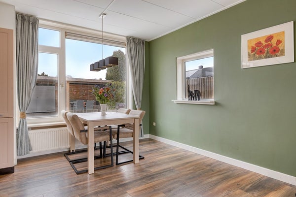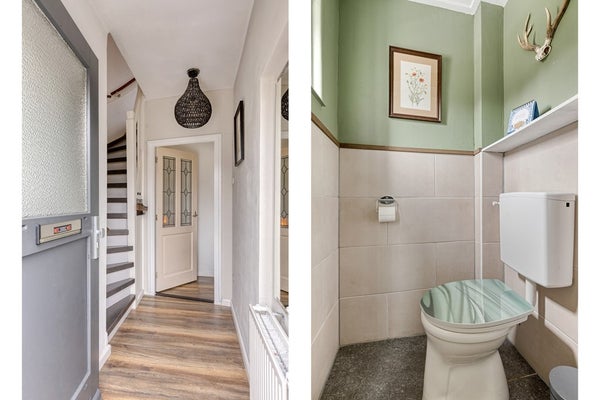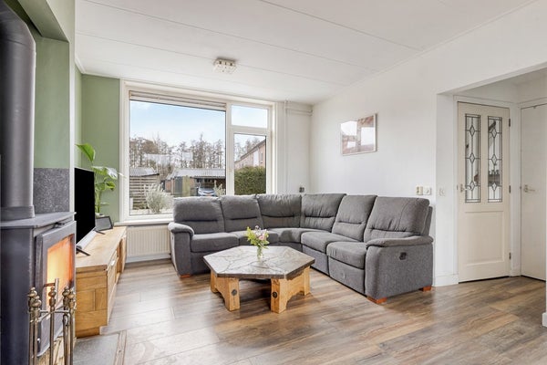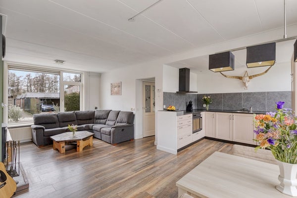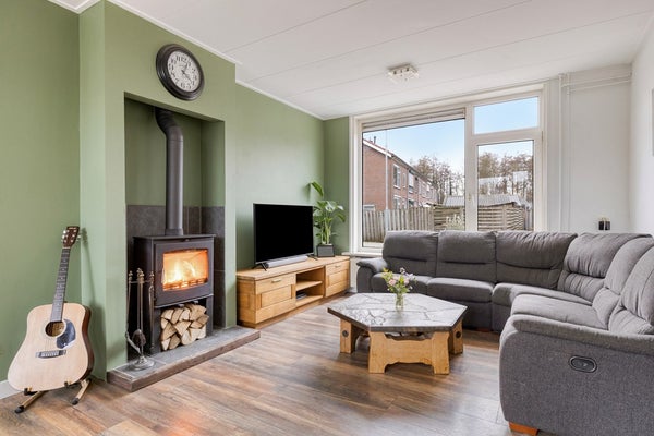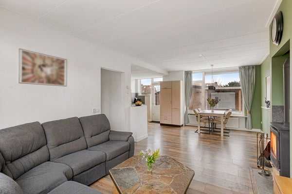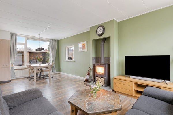 Je komt binnen in de hal met trapopgang, toiletruimte en kelder. Vanuit hier loop je door naar de woonkamer, die praktisch is ingedeeld. Aan de straatzijde bevindt zich de gezellige zithoek, waar de houtkachel direct voor sfeer zorgt. Aan de tuinzijde is ruimte voor de eethoek, grenzend aan de open keuken. Dankzij de grote raampartijen valt er prettig daglicht naar binnen. De open keuken is uitgevoerd in een hoekopstelling met inbouwapparatuur en biedt voldoende werk- en bergruimte.