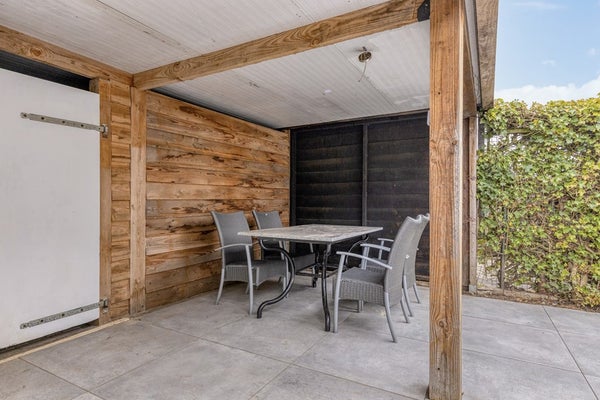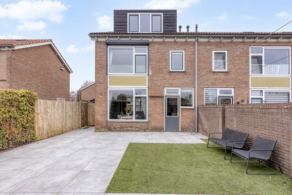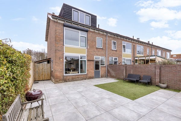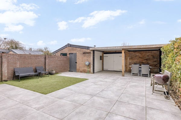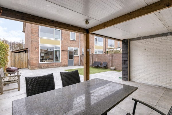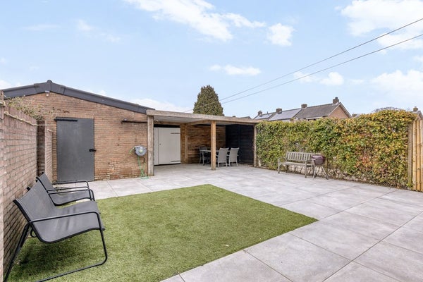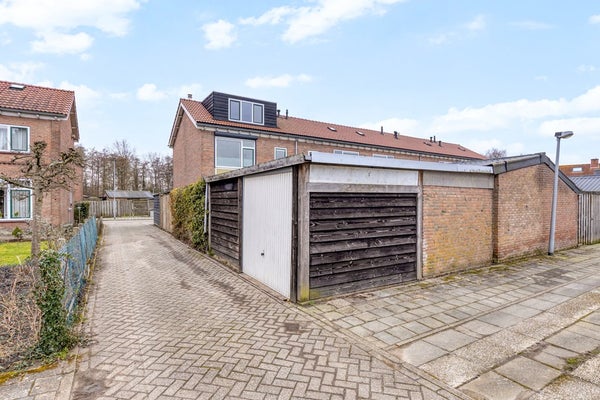 De diepe achtertuin is één van de grote pluspunten van deze woning. Achter op het perceel staat de garage, bereikbaar via het naastgelegen pad. Naast de garage staat een grote stenen berging die vanuit de tuin bereikbaar is. Voor de garage is een gezellige veranda geplaatst, waar je al vroeg in het voorjaar en tot laat in het najaar heerlijk beschut kunt zitten. Daarnaast is er naast de woning nog een extra overkapping gerealiseerd, perfect voor fietsen en containers.