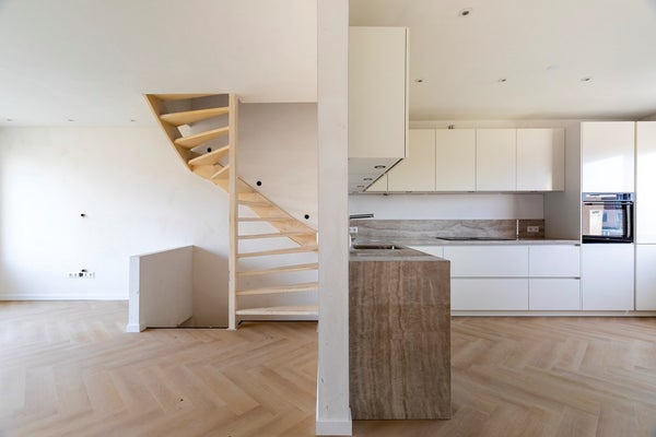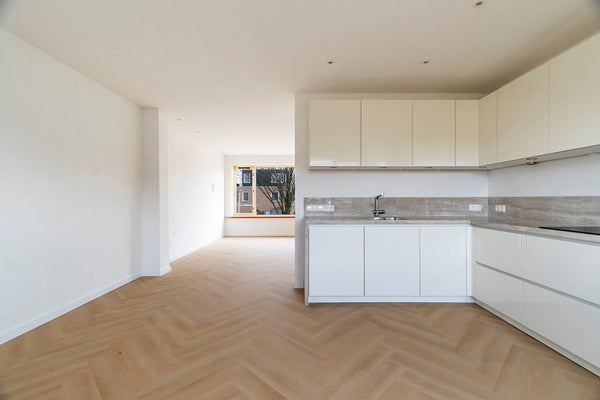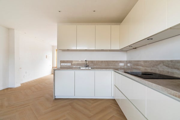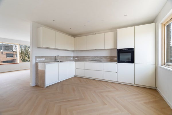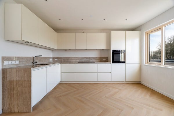 Aan de achterzijde van de woning bevindt zich de moderne L vormige keuken met witte kastjes en een Travertin-look composiet werkblad waarbij de warm-neutrale keuken is voorzien van een inductie Bora kookplaat met geïntegreerde afzuiging, inbouwoven, koelkast en vriezer. Onder de bovenkastjes zijn spotjes geplaatst voor goede werkverlichting en er is gedacht aan voldoende stopcontacten voor onder andere een koffiezetapparaat. De keuken is verder uitgerust met een RVS spoelbak en er is aan de achterzijde van de woning voldoende ruimte voor het plaatsen van een grote eettafel. Het plafond op deze etage is voorzien van inbouwspots. Aan de buitenzijde is een voorbereiding getroffen voor het plaatsen van (zonne-energie gestuurde) rolluiken.