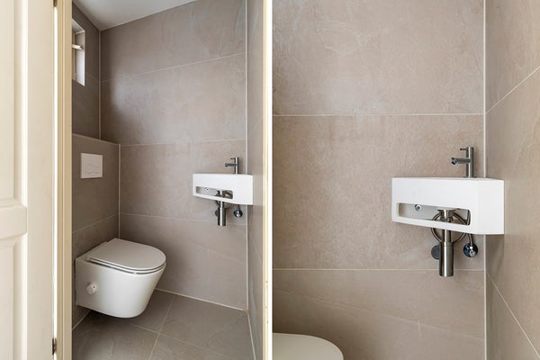 Het zwevend toilet (met bidetfunctie) is nieuw en uitgevoerd met een wit hoekfonteintje en het geheel is betegeld met een zandbeige vloer en wandtegels waarbij een raampje aan de voorzijde van de woning zorgt voor daglicht en natuurlijke ventilatie.