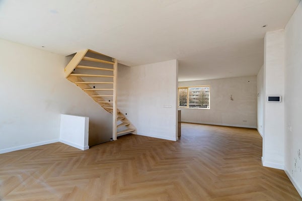 Via de trap bereik je de eerste verdieping en kom je direct binnen in de woonkamer die is afgewerkt met een stijlvolle pvc-visgraatvloer welke is doorgetrokken over de gehele verdieping en aan de voorzijde van de woning zorgen grote raampartijen voor een ruimtelijk en licht gevoel. Aan de buitenzijde is een voorbereiding getroffen voor het plaatsen van (zonne-energie gestuurde) rolluiken.